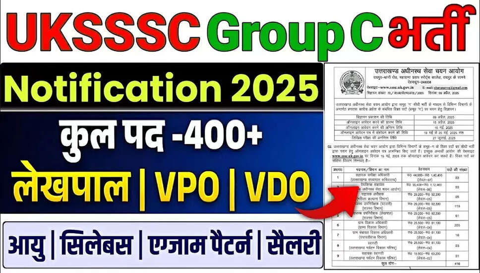 उत्तराखंड अधीनस्थ सेवा चयन आयोग (UKSSSC) ने ग्राम विकास अधिकारी (VDO), पटवारी, लेखपाल, ग्राम पंचायत विकास अधिकारी (VPDO), व्यक्तिगत सहायक और अन्य विभिन्न पदों के लिए भर्ती अधिसूचना जारी की है। इस भर्ती में कुल 416 पदों के लिए आवेदन आमंत्रित किए गए हैं। UKSSSC Group C भर्ती 2025 के लिए ऑनलाइन आवेदन प्रक्रिया 15 अप्रैल 2025 से शुरू हो चुकी है और उम्मीदवार 15 मई 2025 तक आवेदन कर सकते हैं।