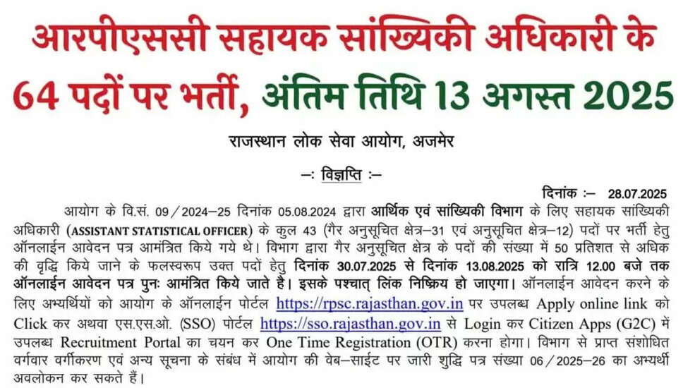 राजस्थान लोक सेवा आयोग (आरपीएससी) ने सहायक सांख्यिकी अधिकारी के 64 पदों के लिए भर्ती का नोटिफिकेशन जारी किया है। सभी इच्छुक महिला और पुरुष अभ्यर्थी ऑनलाइन आवेदन कर सकते हैं। यह भर्ती आर्थिक एवं सांख्यिकीय विभाग के लिए की जा रही है। आवेदन की प्रक्रिया 30 जुलाई से शुरू होकर 13 अगस्त 2025 को रात 12:00 बजे तक चलेगी।