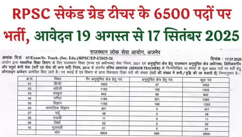 राजस्थान लोक सेवा आयोग (आरपीएससी) ने सेकंड ग्रेड टीचर भर्ती के लिए 6500 पदों का नोटिफिकेशन जारी किया है। यह भर्ती वरिष्ठ अध्यापक के 10 विषयों के लिए की जा रही है। योग्य उम्मीदवार एसएसओ पोर्टल के माध्यम से आवेदन कर सकते हैं। इसमें गैर अनुसूचित क्षेत्र के लिए 5804 और अनुसूचित क्षेत्र के लिए 696 पद शामिल हैं। आवेदन की प्रक्रिया 19 अगस्त से शुरू होकर 17 सितंबर 2025 तक चलेगी।