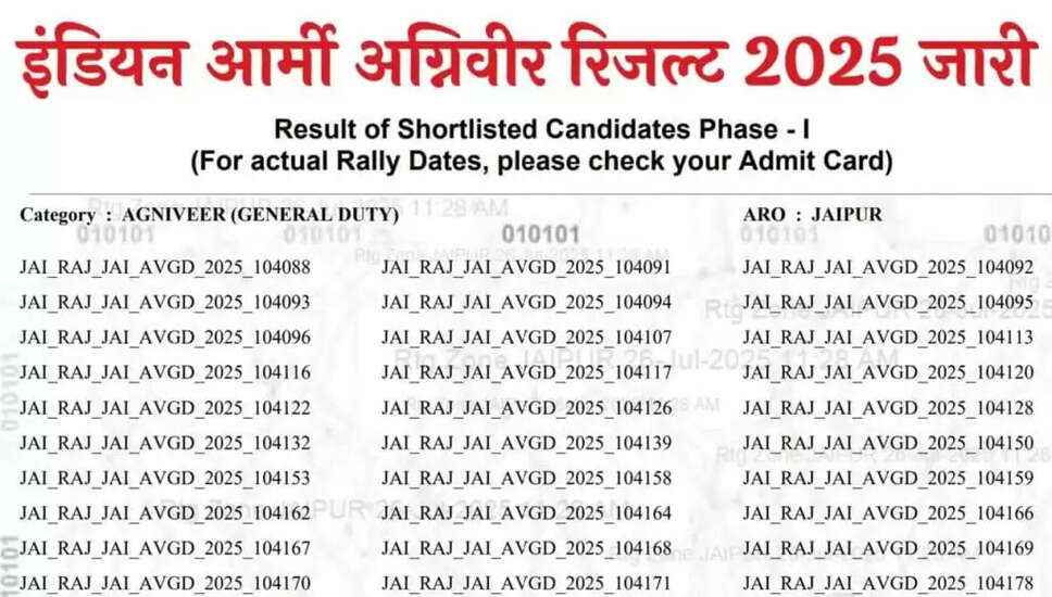इंडियन आर्मी ने आज 26 जुलाई 2025 को अग्निवीर CEE परीक्षा का परिणाम आधिकारिक वेबसाइट पर जारी किया है। सभी ARO का परिणाम पीडीएफ फॉर्मेट में उपलब्ध है, जिसमें उम्मीदवार अपना रोल नंबर देख सकते हैं। इसके अलावा, वे अपने रजिस्ट्रेशन नंबर और पासवर्ड के माध्यम से भी लॉगिन करके परिणाम देख सकते हैं।