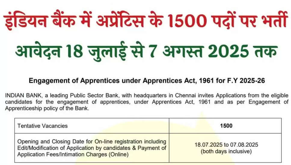 इंडियन बैंक ने अप्रेंटिस के 1500 पदों के लिए भर्ती का नोटिफिकेशन जारी किया है। योग्य उम्मीदवारों से ऑनलाइन आवेदन आमंत्रित किए गए हैं। आवेदन की प्रक्रिया 18 जुलाई से शुरू होकर 7 अगस्त 2025 तक चलेगी। इसके बाद, अभ्यर्थी 22 अगस्त तक आवेदन फॉर्म का प्रिंट आउट ले सकते हैं।