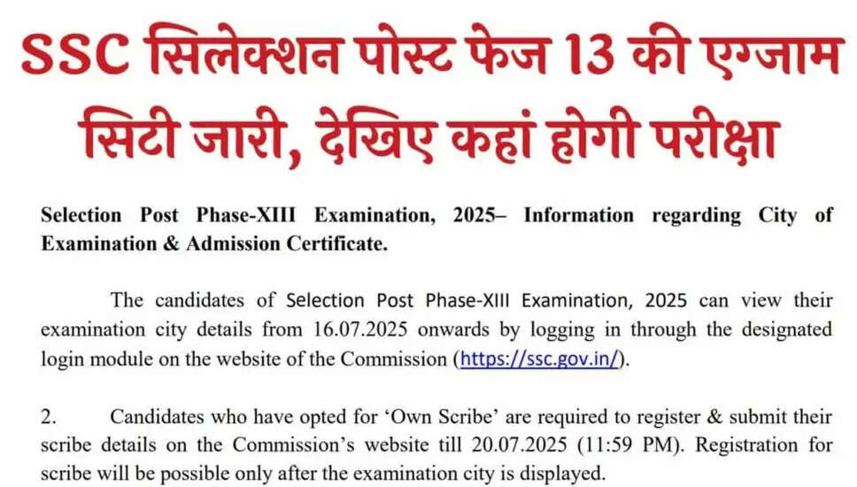 एसएससी सिलेक्शन पोस्ट फेज 13 परीक्षा शहर की जानकारी जारी