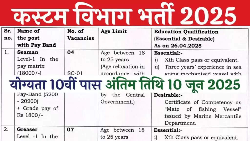 कस्टम विभाग ने 2025 के लिए भर्ती का नोटिफिकेशन जारी किया है, जिसमें ट्रेड्समैन, सीमैन और स्टोकर के पदों पर आवेदन आमंत्रित किए गए हैं। इस भर्ती में महिला और पुरुष दोनों अभ्यर्थी भाग ले सकते हैं। आवेदन प्रक्रिया ऑफलाइन होगी, और फॉर्म भरने की शुरुआत 26 अप्रैल 2025 से होगी, जबकि अंतिम तिथि 10 जून 2025 निर्धारित की गई है।