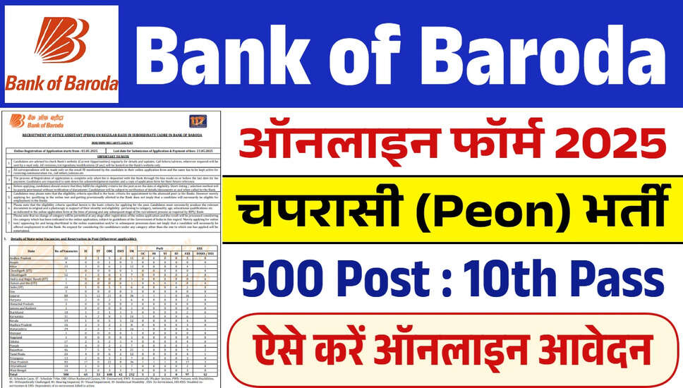 जो युवा दसवीं कक्षा पास कर चुके हैं, उनके लिए चपरासी भर्ती का नोटिफिकेशन जारी किया गया है। बैंक ऑफ़ बड़ौदा ने असिस्टेंट ऑफिस के लिए यह भर्ती निकाली है, जिससे देशभर के उम्मीदवारों को नौकरी पाने का मौका मिलेगा।