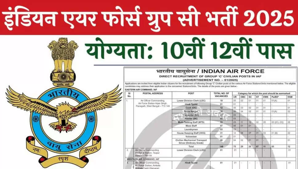 भारतीय वायु सेना ने ग्रुप C के पदों के लिए भर्ती का आधिकारिक नोटिफिकेशन जारी किया है। इस भर्ती में दसवीं पास महिला और पुरुष दोनों अभ्यर्थी आवेदन कर सकते हैं। आवेदन प्रक्रिया ऑफलाइन होगी, और आवेदन फॉर्म 17 मई 2025 से उपलब्ध हैं। अंतिम तिथि 15 जून 2025 निर्धारित की गई है।