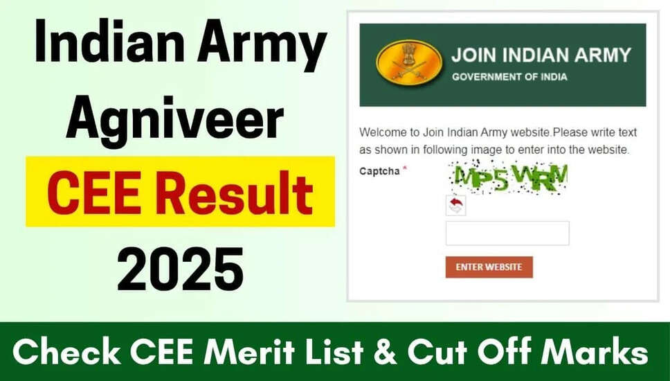 भारतीय सेना ने अग्निवीर सामान्य प्रवेश परीक्षा (CEE) 2025-2026 का परिणाम जारी किया है। यह परिणाम आधिकारिक वेबसाइट पर उपलब्ध है। आवेदन प्रक्रिया 12 मार्च 2025 से शुरू हुई थी और परीक्षा 30 जून से 10 जुलाई 2025 के बीच आयोजित की गई थी। इस लेख में, आप महत्वपूर्ण तिथियों, आवेदन शुल्क, उम्र सीमा और चयन प्रक्रिया के बारे में जानेंगे। सभी उम्मीदवार जो परीक्षा में शामिल हुए थे, वे अपने परिणाम को डाउनलोड कर सकते हैं।