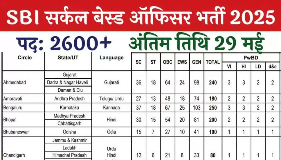 SBI ने सर्कल बेस्ड ऑफिसर के 2600 पदों के लिए भर्ती का नोटिफिकेशन जारी किया है, जिसमें बैकलॉग के लिए 364 पद भी शामिल हैं। ऑनलाइन आवेदन 9 मई 2025 से शुरू हो चुके हैं और अंतिम तिथि 29 मई 2025 है। इसके बाद परीक्षा जुलाई 2025 में आयोजित की जाएगी।
