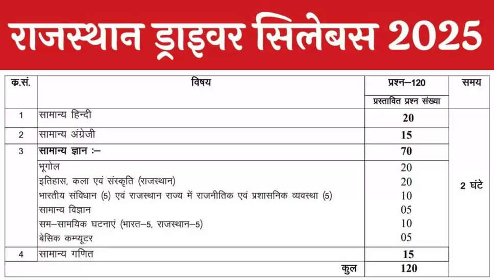 राजस्थान ड्राइवर सिलेबस 2025 और परीक्षा पैटर्न अब आधिकारिक वेबसाइट पर उपलब्ध है। अभ्यर्थी इस सिलेबस के अनुसार अपनी तैयारी कर सकते हैं। परीक्षा में कुल 120 प्रश्न पूछे जाएंगे, जिनमें सामान्य हिंदी, सामान्य अंग्रेजी, सामान्य ज्ञान और सामान्य गणित शामिल हैं।