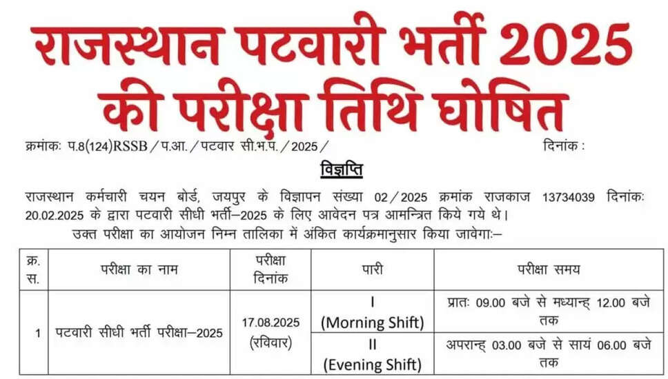 | राजस्थान पटवारी परीक्षा तिथि 2025 | 17 अगस्त 2025 |