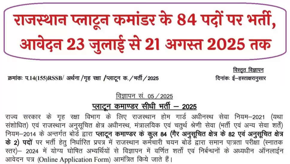 राजस्थान कर्मचारी चयन बोर्ड ने प्लाटून कमांडर के 84 पदों पर भर्ती के लिए नोटिफिकेशन जारी किया है। इसमें गैर अनुसूचित क्षेत्र के लिए 82 और अनुसूचित क्षेत्र के लिए 2 पद शामिल हैं। इस भर्ती के लिए आवेदन 23 जुलाई से 21 अगस्त 2025 तक किए जा सकते हैं।