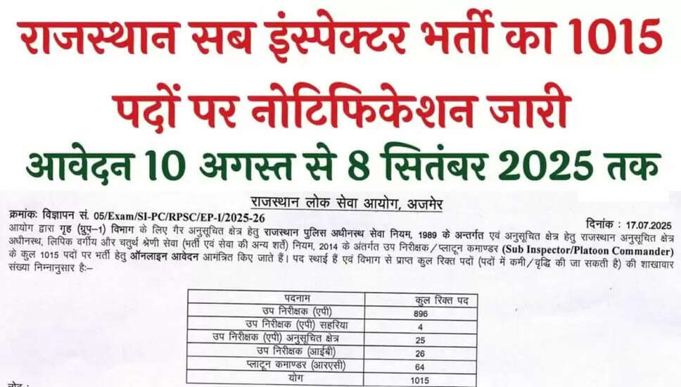 राजस्थान लोक सेवा आयोग (RPSC) ने सब इंस्पेक्टर के 1015 पदों के लिए भर्ती नोटिफिकेशन जारी किया है। यह आधिकारिक सूचना 17 जुलाई 2025 को प्रकाशित हुई थी। इच्छुक उम्मीदवार 10 अगस्त से 8 सितंबर 2025 तक ऑनलाइन आवेदन कर सकते हैं।