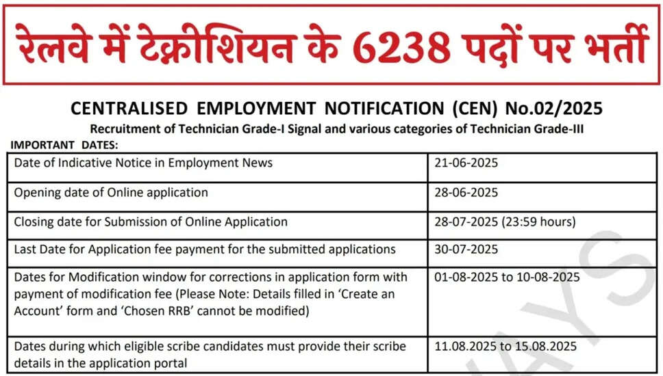 रेलवे टेक्नीशियन भर्ती 2025: 6238 पदों के लिए आवेदन प्रक्रिया शुरू