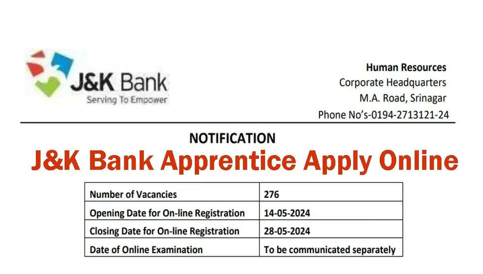 जम्मू और कश्मीर बैंक अपरेंटिस भर्ती 2024: 276 पदों के लिए ऑनलाइन आवेदन करें