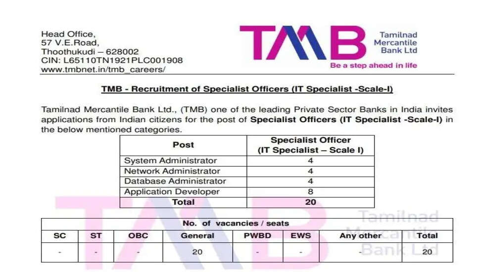 तमिलनाडु मर्केंटाइल बैंक (TMB) ने विभिन्न आईटी भूमिकाओं के लिए 20 विशेषज्ञ अधिकारियों की भर्ती की घोषणा की है। यदि आप बैंकिंग क्षेत्र में अपनी पहचान बनाने वाले एक तकनीक-प्रेमी पेशेवर हैं, तो यह आपके चमकने का अवसर हो सकता है। इस ब्लॉग पोस्ट में, हम आपको पात्रता मानदंड, महत्वपूर्ण तिथियां और ऑनलाइन आवेदन कैसे करें सहित सभी आवश्यक विवरण प्रदान करेंगे।