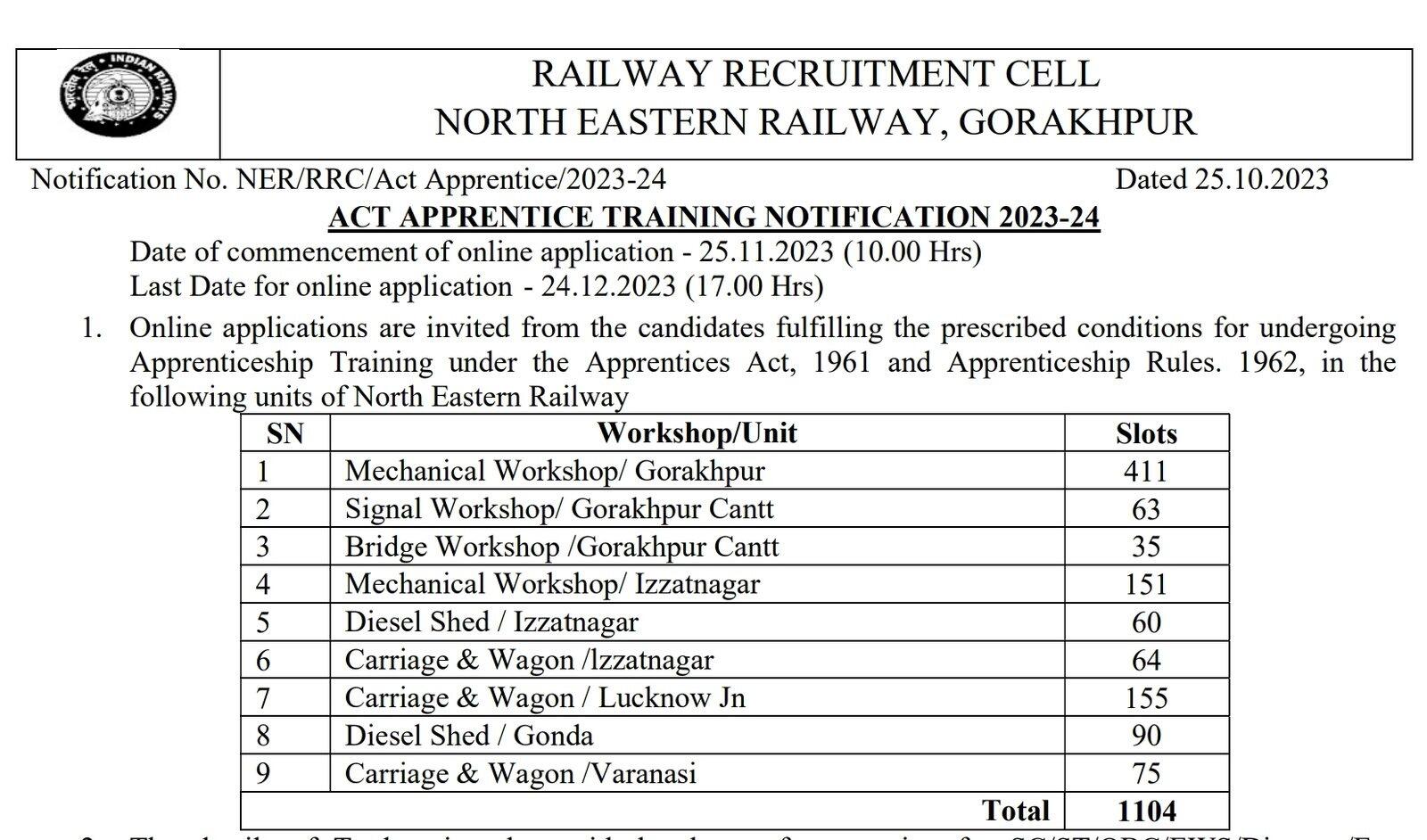 उत्तर पूर्वी रेलवे गोरखपुर विभिन्न ट्रेड अपरेंटिस 2024 के लिए 1104 पदों पर ऑनलाइन आवेदन करें
