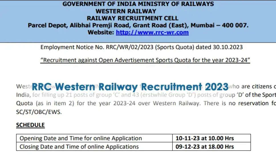 रेलवे भर्ती सेल (आरआरसी), पश्चिमी क्षेत्र (डब्ल्यूआर) ने हाल ही में 18 से 24 नवंबर, 2023 के बीच रोजगार समाचार में जारी एक अधिसूचना के माध्यम से विभिन्न ग्रुप सी पदों के लिए नौकरी की घोषणा की है। इस अधिसूचना में कुल 64 रिक्तियों का खुलासा किया गया है। स्पोर्ट्स कोटा, जिसमें 21 ग्रुप 'सी' और 43 ग्रुप 'डी' पद शामिल हैं।