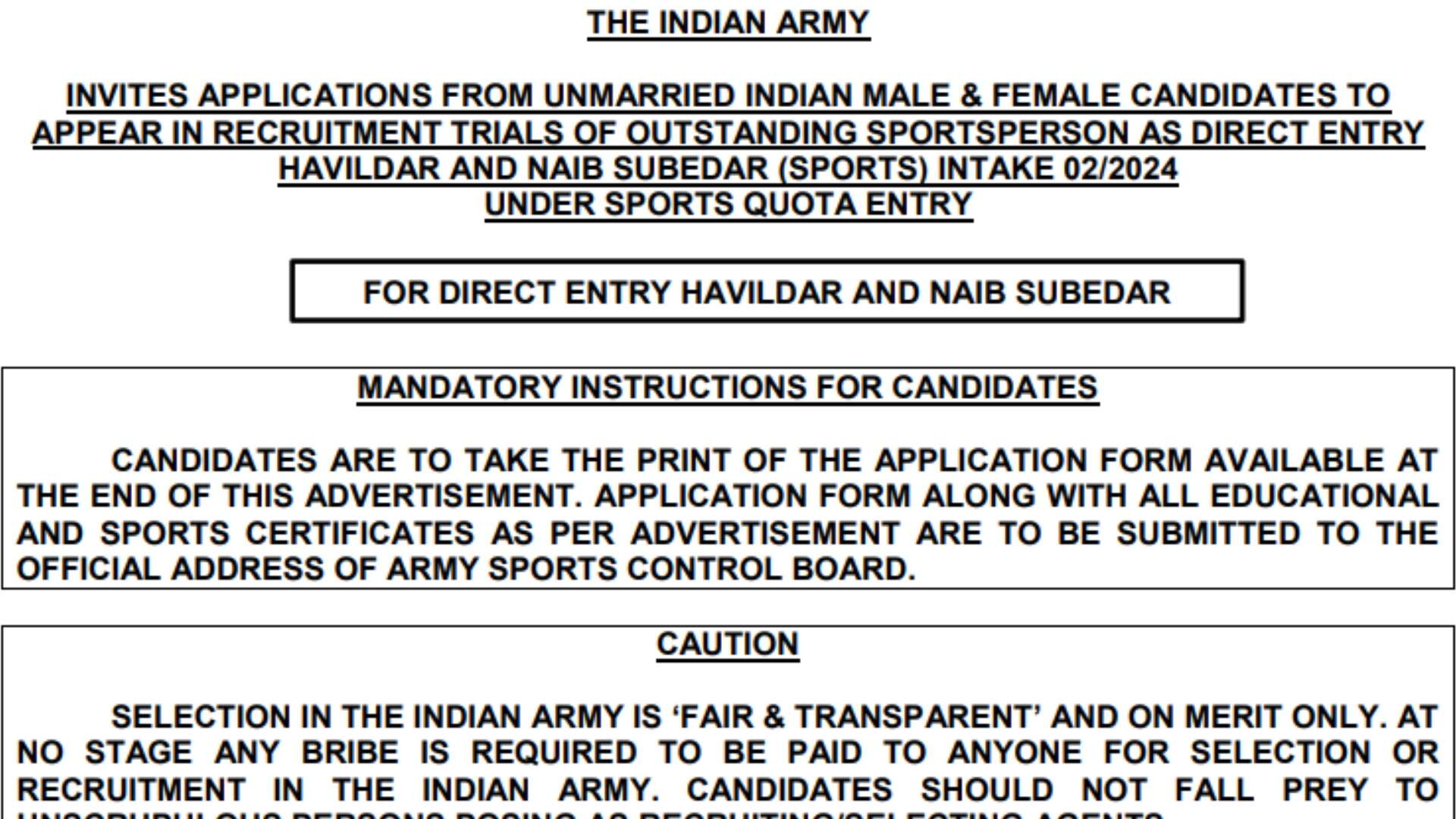 भारतीय सेना भर्ती 2024: हवलदार और नायब सूबेदार (स्पोर्ट्स) के पदों के लिए आवेदन करें