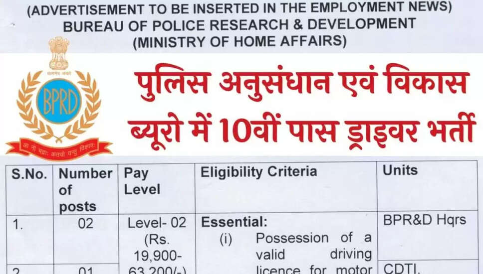 पुलिस अनुसंधान एवं विकास ब्यूरो (BPRD) ने स्टाफ ड्राइवर के पदों के लिए भर्ती का आधिकारिक नोटिफिकेशन जारी किया है। इस भर्ती में सभी भारतीय पुरुष और महिला अभ्यर्थी आवेदन कर सकते हैं। 10वीं पास अभ्यर्थियों से ऑफलाइन आवेदन मांगे गए हैं। आवेदन प्रक्रिया 3 मई 2025 से शुरू होगी और अंतिम तिथि 1 जून 2025 है।