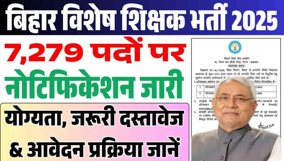 महत्वपूर्ण जानकारी: बिहार लोक सेवा आयोग (BPSC) ने विशेष स्कूल शिक्षक के पद के लिए अधिसूचना जारी की है। इस भर्ती में कुल 7279 पदों के लिए आवेदन आमंत्रित किए गए हैं। BPSC विशेष स्कूल शिक्षक भर्ती 2025 के लिए ऑनलाइन आवेदन प्रक्रिया 02 जुलाई 2025 से शुरू हो चुकी है और उम्मीदवार 28 जुलाई 2025 तक आवेदन कर सकते हैं। उम्मीदवारों को BPSC विशेष स्कूल शिक्षक भर्ती 2025 के लिए सभी विवरणों की जांच करनी चाहिए।