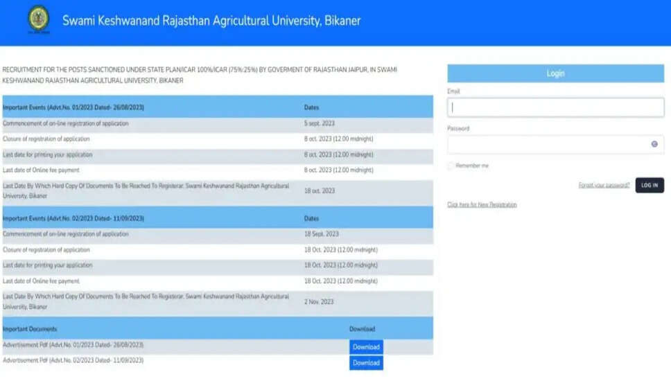 स्वामी केशवानंद राजस्थान कृषि विश्वविद्यालय (SKRAU) ने उप सचिव, लेखा अधिकारी, सहायक रजिस्ट्रार, सहायक अभियंता (सिविल) और अन्य सहित विभिन्न पदों पर भर्ती के लिए एक अधिसूचना जारी की है। इच्छुक उम्मीदवार जो पात्रता मानदंडों को पूरा करते हैं, वे अधिसूचना को पढ़ सकते हैं और ऑनलाइन आवेदन कर सकते हैं।