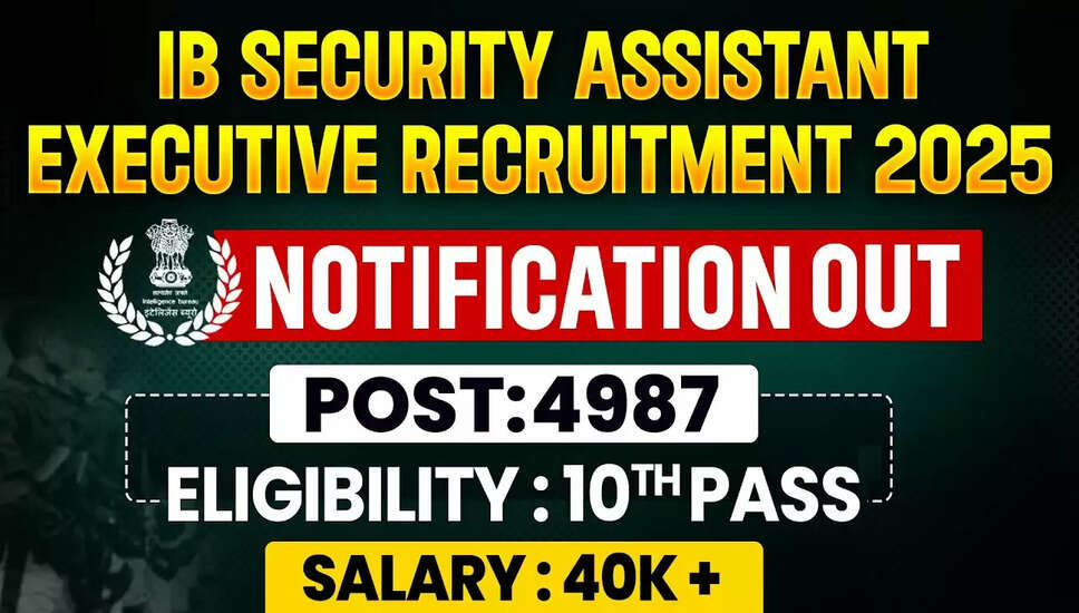 महत्वपूर्ण जानकारी: गृह मंत्रालय की खुफिया ब्यूरो (IB) ने हाल ही में सुरक्षा सहायक/कार्यकारी पदों की भर्ती के लिए एक संक्षिप्त सूचना जारी की है। इस भर्ती में कुल 4987 पदों के लिए आवेदन आमंत्रित किए गए हैं। IB सुरक्षा सहायक/कार्यकारी भर्ती 2025 के लिए ऑनलाइन आवेदन प्रक्रिया 26 जुलाई 2025 से शुरू होगी और उम्मीदवार 17 अगस्त 2025 तक आवेदन कर सकते हैं। उम्मीदवारों को IB सुरक्षा सहायक/कार्यकारी भर्ती 2025 के लिए सभी विवरणों की जांच करनी चाहिए।
