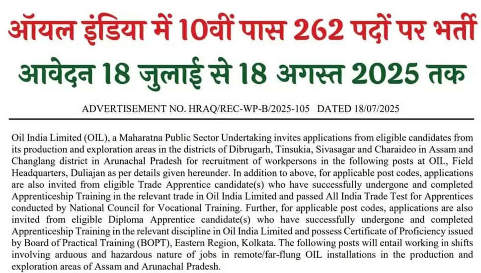 OIL इंडिया वर्कपर्सन भर्ती 2025: 262 पदों के लिए आवेदन प्रक्रिया शुरू