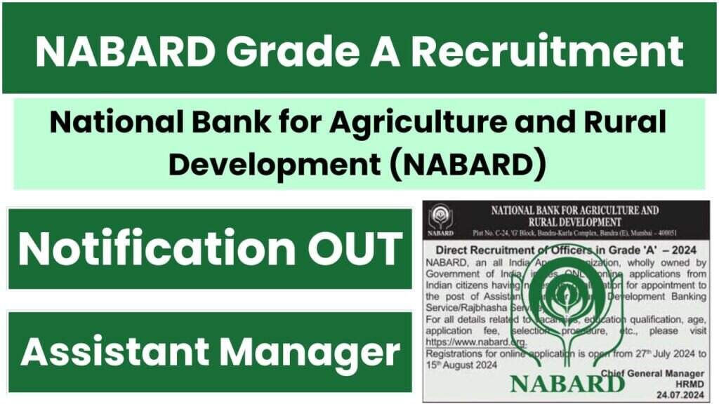 राष्ट्रीय कृषि और ग्रामीण विकास बैंक (NABARD) ने विभिन्न पदों के लिए सहायक प्रबंधक ग्रेड ए की भर्ती के लिए अधिसूचना जारी की है। इच्छुक उम्मीदवार 27 जुलाई 2024 से 15 अगस्त 2024 तक ऑनलाइन आवेदन कर सकते हैं। भर्ती प्रक्रिया का विवरण नीचे दिया गया है।