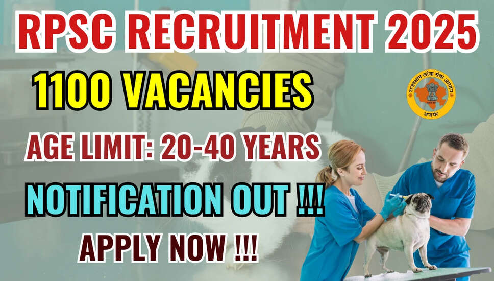 राजस्थान लोक सेवा आयोग (RPSC) ने पशु चिकित्सा अधिकारी के पदों के लिए भर्ती अधिसूचना जारी की है। इस भर्ती में कुल 1100 पदों के लिए आवेदन आमंत्रित किए गए हैं। इच्छुक उम्मीदवार 05 अगस्त 2025 से 03 सितंबर 2025 तक ऑनलाइन आवेदन कर सकते हैं। भर्ती से संबंधित सभी आवश्यक जानकारी नीचे दी गई है।