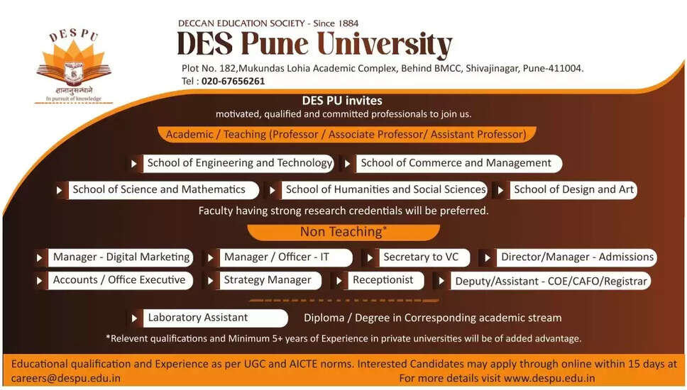 डेक्कन एजुकेशन सोसाइटी पुणे (डीईएस पुणे) ने असिस्टेंट प्रोफेसर के पदों पर रिक्तियों की घोषणा की है। यदि आपमें पढ़ाने का जुनून है और आप पात्रता मानदंडों को पूरा करते हैं, तो यह एक प्रतिष्ठित शैक्षणिक संस्थान में शामिल होने का एक शानदार अवसर है। रिक्तियों के विवरण, महत्वपूर्ण तिथियों और आवेदन प्रक्रिया के बारे में अधिक जानने के लिए आगे पढ़ें।