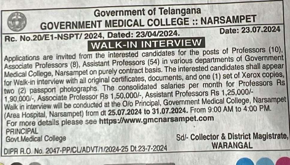 GMC वारंगल भर्ती 2024: 72 प्रोफेसर और सहायक प्रोफेसर पदों के लिए वॉक-इन साक्षात्कार