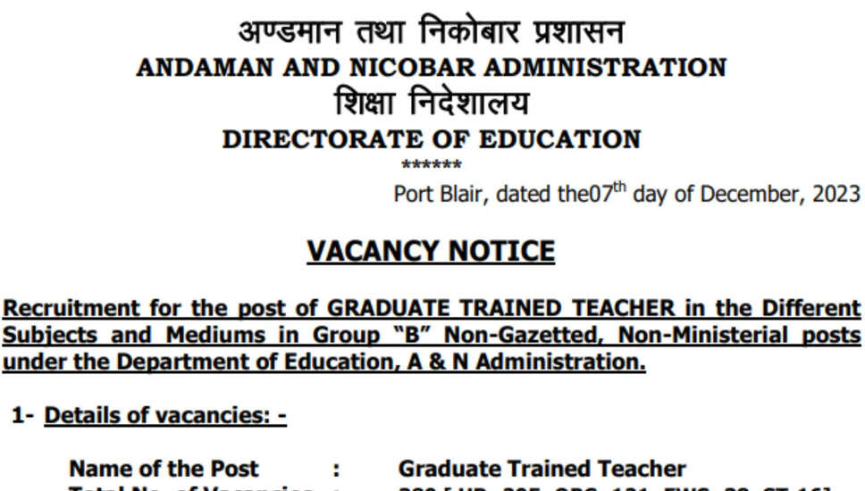 अंडमान और निकोबार प्रशासन के शिक्षा विभाग ने कुल 380 पदों पर ग्रेजुएट प्रशिक्षित शिक्षक (जीटीटी) के लिए भर्ती की घोषणा की है। इस भर्ती के लिए पुरुष और महिला दोनों उम्मीदवार आवेदन करने के पात्र हैं, और आवेदन की अंतिम तिथि 30 दिसंबर, 2023 है।