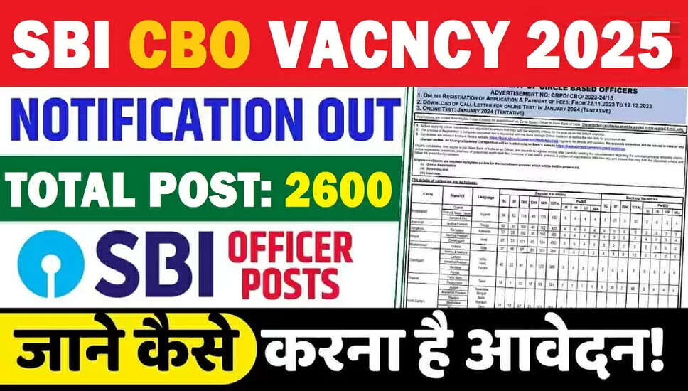 भारतीय स्टेट बैंक (SBI) ने 2025 के लिए सर्कल बेस्ड ऑफिसर्स (CBO) की भर्ती के लिए अधिसूचना जारी की है। इस भर्ती में कुल 2600 पदों के लिए आवेदन आमंत्रित किए गए हैं। इच्छुक उम्मीदवार 09 मई 2025 से 29 मई 2025 तक ऑनलाइन आवेदन कर सकते हैं। इस लेख में आवेदन प्रक्रिया, महत्वपूर्ण तिथियाँ, आयु सीमा, शैक्षणिक योग्यता और चयन प्रक्रिया के बारे में विस्तृत जानकारी दी गई है।